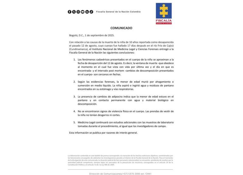 El Instituto Nacional de Medicina Legal reveló que la causa de muerte fue “ahogamiento o sumersión en medio líquido”, y subrayó que no se detectaron signos de abuso físico o sexual.
